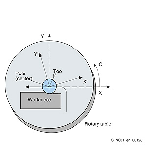 При TRANSMIT достигается область полюса трансформации, если центр инструмента может позиционироваться минимум до центра вращения круговой оси, входящей в трансформацию.