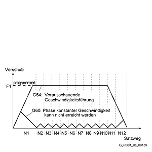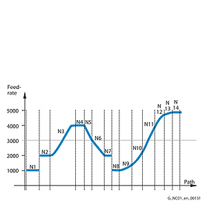 Максимальная путевая, осевая, а также скорость шпинделя подвергается влиянию динамики станка, привода и предельной частоты регистрации действительных значений (предельная частота датчика и предельная частота входа). Равнодействующая скорость из запрограммированной длины пути в кадре ЧПУ и такте интерполяции (IPO-такте) всегда ограничивается максимальной скоростью или, при короткой длине пути, сокращается на скорость перемещения в IPO-такте.