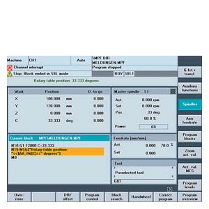 Аварийные и вспомогательные сообщения с PLC: Специфические для станка аварийные и вспомогательные сообщения могут переноситься открытым текстом для индикации из программы PLC. Вспомогательные сообщения состоят из рабочих и сообщений об ошибках. В то время как при рабочих сообщениях индикация сбрасываются переходом в нерабочее состояние, то сообщения об ошибках должны постоянно подтверждаться. Специально для пользователя номера общих, специфических для канала, осей и шпинделей аварийных и вспомогательных сообщений могут распределяться в диапазоне от 40000 до 89999. Реакция системы управления на аварийные и вспомогательные сообщения проектируется. Спроектированные тексты сообщений закладываются в текстовые файлы пользователя.