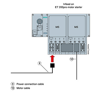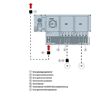 Обозначения: (1) Разъем силового фидера (2) Силовые соединительные разъемы (3) Разъем силового штекера (4) Разъемы подключения двигателя (5) Разъемы подключения к двигателю (6)Разъемы двигателя с EMC подавляющими цепями (7) Разъемы для подключения силовых модулей расширения (8) Подключение силового кабеля (9) Подключение силового кабеля для отдельного модуля (10) Кабели двигателей