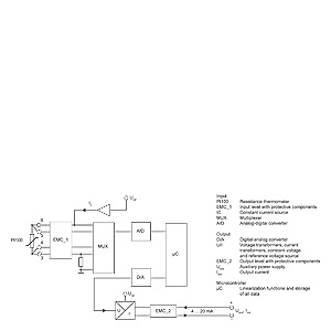 Принцип работыПодаваемый с Pt100 (2, 3 или 4-проводная схема) сигнал измерения усиливается на входном каскаде. Пропорциональное входной величине напряжение после этого преобразуется в аналого-цифровом преобразователе в цифровые сигналы. В микропроцессоре они пересчитываются в соответствии с характеристикой сенсора и прочими параметрами (диапазон измерения, демпфирование, внешняя температура). Подготовленный таким образом сигнал преобразуется в цифрово/аналоговом преобразователе в независимый от нагрузки постоянный ток от 4-20 мА. Фильтр ЭМС защищает входную и выходную схемы от электромагнитных помех. SITRANS TH100, функциональная схема |