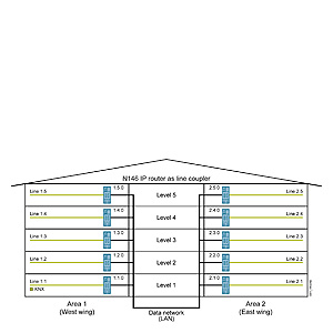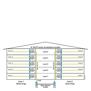 В современной топологии магистральные устройства сопряжения заменены на шлюзы N 146 IP. В этом случае (для примера), благодаря использованию стандартных сетевых компонентов, связь между двумя зданиями более не ограничена длиной шинного кабеля. Другие системы, такие как оптоволокно или W-LAN, также могут быть использованы для связи отдельных зданий и для обмена телеграммами с групповыми адресами.