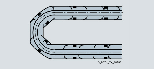 Особенно на радиусах изгиба подвижного короба кабели должны двигаться без усилий. Запрещено выходить за нижний предел заданных минимальных радиусов изгиба.
