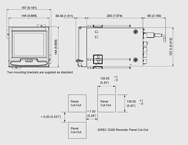 SIREC D200, размеры в мм (дюймах) и вырез в панели |