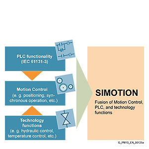 Система SIMOTIONСистеный подход SIMOTION может использоваться во всех станках, где требуется контролировать перемещения - начиная с маленьких и заканчивая сложными высокопроизводительными станками. Упор делается на простые и гибкие решения во всех задачах, где необходимо реализовать функции управления перемещениями. Для достижения этой цели был разработан новый подход к построению таких систем: Функции управления перемещениями комбинированы с другими двумя функциями, которые наиболее часто встречаются в большинстве станков, а именно, функции программирования логики и технологические функции. Такой подход позволяет управлять логикой работы всего станка и каждой осью в отдельности с помощью одной системы. Тоже самое можно сказать и про технологические функции, такие как управление давлением в гидравлических осях. Таким образом может производиться плавное переключение между управлением положением и давлением. Комбинирование в обдной системе функции управления перемещениями,логические и технологические функции имеет следующие преимущества:
