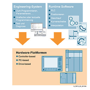 Система SIMOTION состоит из трех компонентов: Среда разработкиУправление перемещениями, логические и технологические задачи программируются все внутри одной интегрированной среды разработки. Эта среда разработки предоставляет все необходимые средства для реализации этих задач: Начиная от программирования и параметрирования и заканчивая тестированием, запуском в эксплуатацию и диагностикой Программные Runtime модулиЭти модули предоставляют разнообразные технологические функции и функции управления движением. Функционирование всей системы может быть подстроено под конкретный станок с помощью выбора соответствующих модулей. Аппаратные платформыАппаратные платформы являются основой системы SIMOTION Motion Control. Приложение разработанное с помощью среды разработки и необходимые программные runtime модули могут использоваться на различных платформах.