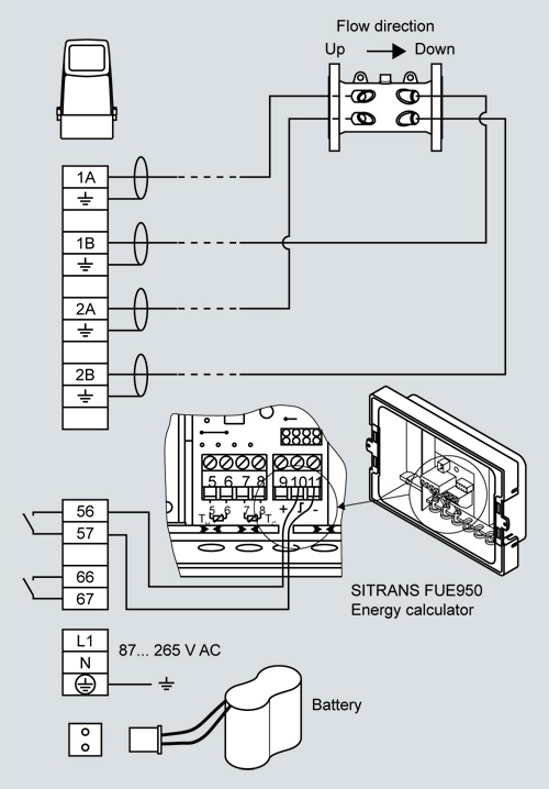 На схеме отображено соединение разъемов кабеля передатчика, а так же подключение питания к счетчику SITRANS FUE950. |