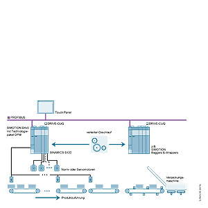 Решение для автоматизацииСистема контроля движения SIMOTION в сочетании с системой привода SINAMICS S120 и нашими высокодинамичными двигателями (напр., серии 1FK) предлагает эффективные решения для требовательных и высокодинамичных приводов. PROFIBUS DP или PROFINET IO используются изохронно для связи с оборудованием для упаковки, а также для "распределенного синхронного функционирования". |