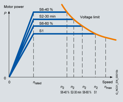 На графике показана зависимость между скоростью двигателя и мощностью 1PH7 двигателя для типа нагружения IEC 60034-1: