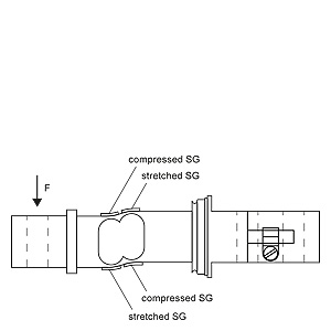 Весоизмерительные ячейки - это датчики, преобразующие механическую величину (вес) в электрический сигнал. Основным элементом является специальное пружинное тело, на котором расположены динамически привязанные измерительные полоски (DMS). DMS состоят из тонкого изоляционного материала, который интегрирована резистивная пленка. Под действием веса F пружинное тело деформируется (см. принципиальную схему), а вместе с ним и DMS. При изменении внешней формы DMS меняется и омическое сопротивление ее проводника. Верхняя левая и нижняя правая DMS cплющиваются, их резистивная пленка сокращается, а омическое сопротивление соответственно уменьшается. Верхняя правая и нижняя левая DMS растягиваются, их резистивная пленка расширяется, а омическое сопротивление увеличивается. В каждой измерительной ячейке имеется минимум четыре DMS, подключенных таким образом, что вместе они составляют полноценный мост Уитстона. Растянутые и сплющенные DMS подключены так, что положительные или отрицательные изменения сопротивления прибавляются к общему рассогласованию моста. На одну диагональ моста подается напряжение питания (при 6-проводной технологии также и напряжение датчика, SENSE), а с другой диагонали снимается измерительное напряжение. При постоянном напряжении питания (EXC) измерительное напряжение (SIG) изменяется пропорционально поданной нагрузке.