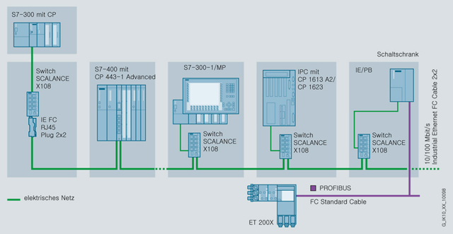 Звездообразная структура сети с SCALANCE X-108 Электрическая линейная структура сети со SCALANCE X108 Оптическая линейная структура сети со SCALANCE X104-2