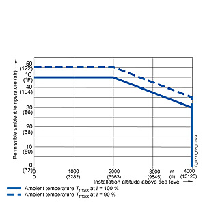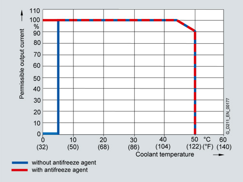 Зависимость тока от температуры охлаждающей жидкости Зависимость тока от температуры окружающей среды Зависимость тока от высоты установки Примечание:Для высоты установки больше 2000 м (6562 фута), происходит уменьшение тока за счет внутренних потерь в окружающую среду. Уменьшения тока не происходит при использовании дополнительного внешнего вентилятора для охлаждения. Снижение напряжения зависит о от высоты установки |
