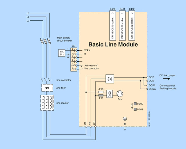 Базовые линейные модули взаимодействуют с блоком управления CU320 или SIMOTION D с использованием DRIVE-CLiQ Стандартное подключение базового линейного модуля |