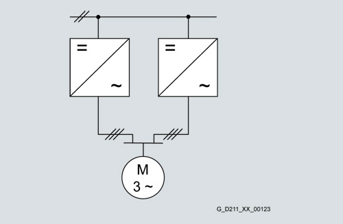 Параллельное подключение блоков питанияПараллельно могут быть подключены до 4 Модулей Двигателя или сетевые модули в формате шасси. Параллельные соединения могут работать только в векторном режиме управления. Параллельные соединения могут включать только Модули Двигателя или Модули Линии одного типа и с теми же характеристиками напряжения и выходной мощности. Комбинации различных модулей, например, Базовые Модули Линии и Активные Модули Линии, не могут быть подключены параллельно. Блок Управления CU320 или SIMOTION D может управлять только одним объектом привода типа «Модули Линии параллельного подключения» (“Parallel connection Line Modules") и одним объектом типа «Модули Двигатели параллельного подключения» ("Parallel connection Motor Modules"). Подразумевается, что все Модули Линии или Модули Двигателя, подсоединённые к Блоку Управления, подключены параллельно. Блок Управления может управлять, например, следующими компонентами: 1 Модуль Линии + 2 Модуля Двигателя, подключённые параллельно, 2 Модуля Линии, подключённые параллельно + 3 Модуля Двигателя, подключённые параллельно. Следующие комбинации недопустимы: 2 Модуля Линии + 2 Модуля Двигателя, подключённые параллельно + 1 Модуль Двигателя Для обеспечения симметричного распределения тока по всем параллельно подключённым модулям, для развязки подсистемы должны быть представлены индуктивности. Несмотря на это, компенсационное управление током не может полностью исключить асимметричное распределение, что означает, что для параллельных подключений устанавливаются следующие коэффициенты снижения номинальных значений: