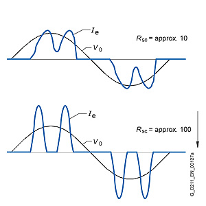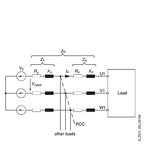 Если конфигурация привода не может обеспечить минимально необходимую длину кабеля, для Модуля Двигателя должен быть установлен соответствующий реактор двигателя. Кроме того, могут быть использованы двигатели с двумя отдельными системами обмотки. Параллельное подключение при помощи идентичных кабелей двигателей требуемой минимальной длины Использование реакторов двигателя Асинхронный двигатель (индуктивный двигатель) с двумя отдельными системами обмотки Управление вентиляторомБлоки книжного формата включают управляемый температурой вентилятор, предназначенный для охлаждения блока питания. Вентилятор не включается до тех пор, пока температура в теплопоглощающем устройстве не достигнет 56 °C (132,8°F). Вентилятор питается от внешнего источника питания 24-вольтной сети DC или от цепи DC при помощи включаемой подачи питания. На блоках книжного формата и формата шасси вентилятор включается, когда включены импульсы блока питания. Возмущение в системеСнижение напряжения между системой электропитания и нагрузкой, обусловленное импедансом, наблюдается до тех пор, пока в цепи течёт ток. В симметричной трёхфазной системе электропитания это импеданс цепи Zn, который рассчитывается из импеданса Zs системы электропитания и импеданса Ze нагрузки. Эффективный импеданс, когда нагрузка подаётся к трёхфазной системе электропитания Ток в цепи Базового Модуля Линии или Силового Модуля как функция отношения Rsc мощности короткого замыкания Среднеквадратичное значение линейного тока Ie, для которого должны оцениваться составляющие, состоит из основной гармонией Ie1 и гармоник тока, которые увеличивают отношение Rsc мощности короткого замыкания. Если была рассчитана мощность Pd в цепи DC (смотрите Модули Линии), требуемая активная мощность является известной величиной эффективности Модуля Линии или эффективности выпрямителя в случае Силового Модуля. Несмотря на это, активная мощность связана только с основной гармоникой тока Ie1. Среднеквадратичное значение линейного тока Ie всегда больше, чем Ie1 из-за воздействия гармоник тока. Следующее верно для отношения Rsc = 100 мощности короткого замыкания: S2 = P2 + Q12 + D2 Отношение между активной мощностью и полной мощностью называется коэффициентом мощности λ или коэффициентом суммарной мощности: Типичная форма колебаний сигнала линейного тока Силовых Модулей и Модулей Линии Компоненты цепи (главный выключатель, предохранители, сетевые фильтры и т.д.)Для конфигурации привода рекомендуется использовать следующие компоненты Главный выключатель может быть различных форматов: • Главный выключатель АВАРИЙНОЙ ОСТАНОВКИ + прерыватель с предохранителем (с основным сигналом, поступающим через вспомогательный контакт для режима отключения) Для защиты блоков от бросков напряжения рекомендуется устанавливать защиту от перенапряжения прямо на точку подачи питания (вверх по цепи от главного выключателя). Защита от перенапряжения необходима в соответствии с требованиями канадского стандарта CSA C22,2 No. 14. Для примеров использования предохранителей от перенапряжения посетите http://www.raycap.com. В зависимости от требуемой производительности, в качестве главного выключателя может выступать прерыватель с предохранителем вместе с замыкателем или автоматическим выключателем. |