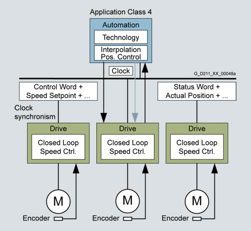 PROFIdrive определяет модель устройства на основании функциональных модулей, действующих в устройстве и генерирующих интеллектуальность системы привода. У этих модулей есть объекты, назначенные им, описанные в профиле и определенные в соотношении с их функциями. Следовательно, общая функциональность привода описана с использованием совокупности его параметров. В отличие от других профилей приводов, PROFIdrive определяет только механизмы доступа к параметрам, а также подмножество параметров профиля (приблизительно 30), таких как ошибка буфера, контроль приводов и идентификация устройства. Все остальные параметры зависят от поставщика, благодаря чему у производителей приводов появляется большая степень гибкости касательно реализации функций контроля. Доступ к элементам параметров предоставляется ациклично с использованием так называемого канала параметров DP-V1. В качестве протокола связи PROFIdrive использует расширения DP-V0, DP-V1 и DP-V2 для PROFIBUS, включая функции "связь дополнительный модуль-к-дополнительному модулю" и "равноудаленная эксплуатация" или PROFINET IO с классами в режиме реального времени RT и IRT. PROFIdrive и SINAMICSКатегория использования 4 — наиболее важная для высокодинамичных и чрезвычайно сложных задач контроля движения. В этой категории использования подробно описывается взаимодействие основного и дополнительного модулей между контроллером и приводами, подключенными к друг другу с помощью PROFIBUS и PROFINET. Функция DSC (Динамический контроль Servo) значительно улучшает динамический отклик и фиксированность схемы позиционного управления путем минимизации периодов простоя, как правило, возникающих при использовании интерфейсов контрольных точек скорости с дополнительной, относительно простой сетью обратной связи на приводе. Схема позиционного управления закрыта на приводе, что обеспечивает возможность очень быстрых циклов контроля (например, 125 μs для SINAMICS S) и, таким образом, ограничивает периоды простоя для режима контроля. В SINAMICS S интерфейс привода был реализован в соответствии с профилем PROFIdrive V4 и категориями использования с 1 до 4 (Категория 4 с и без DSC). Ниже называется интерфейсом PROFIdrive. |
