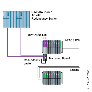 Децентрализованное резервирование и использованием резервированной станции AS 417HПример конфигурации для децентрализованного резервирования с использованием AS 417H (AS 417-4-2H). В случае децентрализованного резервирования, каждая резервированная PCS 7 APACS+ DP/IO bus links, соединяется со старой стойкой APACS+ контроллера через плату сопряжения к одному или двум резервированным каналам PROFIBUS DP Master, резервированной станции AS 417H (AS 417-4-2H). Для синхронизации 2 резервированные PCS 7 APACS+ DP/IO bus links, дополнительно подсоединяются с DP/IO, резервированным кабелем через плату сопряжения. Показанный пример конфигурации нерезервированной архитектуры, может быть использован в децентрализованном резервировании с применением резервированной станции AS 417H. |