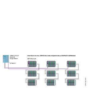Нерезервированная конфигурация с одиночной станцией AS 417HПример максимальной конфигурации нерезервированной архитектуры с одиночной станцией AS 417H (AS 417‑4‑1H). PCS 7 APACS+ DP/IO bus link вставляется вместо APACS+ CPU в старую стойку контроллера, подключенную, через плату сопряжения к PROFIBUS DP Master интерфейсу одиночной станции AS 417H. К каждой станции AS 417H, можно подсоединить, через 2 встроенных PROFIBUS DP Master интерфейса и один модуль CP 443-5, до 3 PCS 7 APACS+ DP/IO bus links, каждая с до 28 модулями APACS+ I/O. В сумме, это означает, что максимально можно подсоединить до 84 APACS+ I/O. Актуальное количество зависит от типа канала и используемых модулей ввода/вывода. Типовое количество - от 15 до 25 модулей APACS+ I/O на один PCS 7 APACS+ DP/IO bus link. Максимальная конфигурация может быть определена, используя калькуляцию памяти, приведенную в таблице ниже. При этом, требуемое количество памяти должно быть умножено на количество соответствующих модулей. Дополнительно. требуемое количество памяти для канала, должно быть умножено на количество соответствующих каналов. Суммарный объем памяти, не должен превышать 65 536 байт.