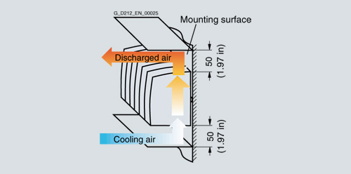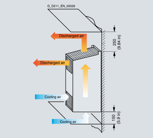 Вентиляционные зазоры для компонетов книжного формата с внешним охлаждением Модули питания 5 кВт to 55 кВт; Моторные модули от 3 A до 85 A1). Установочная высота внешнего встроеннного вентилятора также равна 376 мм от нижнего края Активного модуля питания от 80 Квт до 120 кВт, также как и для моторного модуля от 132А до 200А. Свободное пространство спереди от ≥ 50 мм требуется оставить.
