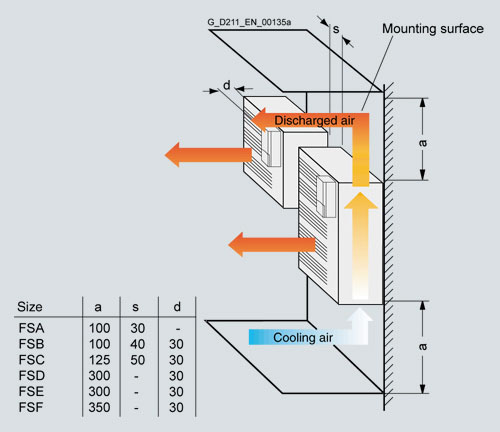 Вентиляционные зазоры для компонентов книжного формата При установке в ряд нескольких устройств, минимальный боковой зазор между Силовыми Модулями должен соответствовать заданному значению в зависимости от определенного типоразмера оборудования. Силовые Модули типоразмеров FSA, FSD, FSE и FSF вплотную друг у другу. Вентиляционные зазоры для компонетов книжного формата с внутренним охлаждением Силовые модули 5 кВт до 55 кВт; Вентиляционные зазоры для компонетов книжного формата с внутренним охлаждением Активные силовые модули 80 кВт и 120 кВт