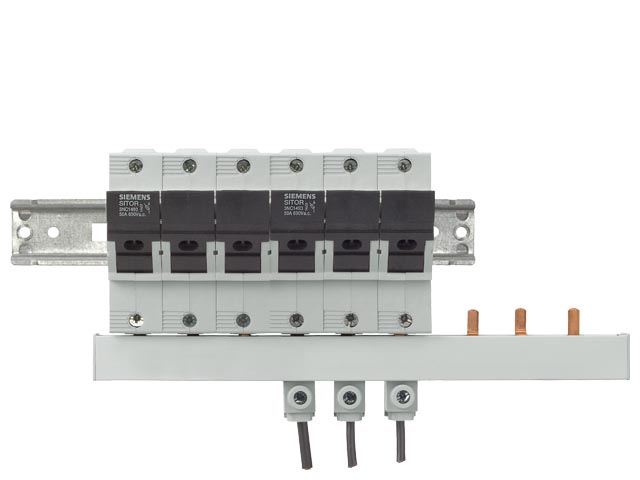 - Монтаж с помощью сборной шины и прямой ввод питания на основания предохранителей через вводные клеммы сечением до 35 mm²