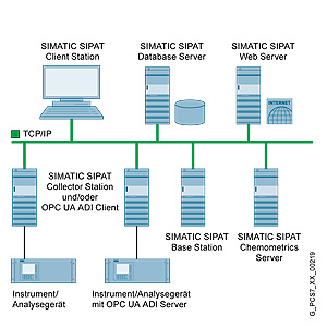 Пример распределенной архитектуры SIMATIC SIPAT Программное обеспечение, поставляемое на DVD с SIMATIC SIPAT V3.0, представлено следующим образом: SIMATIC SIPAT Central Database Центральная реляционная база данных, содержащая конфигурацию и рабочие данные. SIMATIC SIPAT Station Service Сервисы Windows для сбора данных, вычислений и т.д.. SIMATIC SIPAT Productivity Pack Единый интерфейс для интеграции анализов в SIMATIC SIPAT. В комбинации с разработанными поставщиками оборудования программным обеспечением, позволяет параметризировать, калибровать и контролировать эти устройства в дополнение к сбору данных. SIMATIC SIPAT Watchdog Service Windows сервис для мониторинга доступности конкретных SIMATIC SIPAT станций. SIMATIC SIPAT Data Logger Service Windows сервис для хранения рантайм данных (запись в центральную базу SIMATIC SIPAT, буферизирование событий о перебоях питания) SIMATIC SIPAT Workflow Service Windows сервис для выполнения онлайн параметризации/калибрования анализаторов и подготовки SIMATIC SIPAT методов. SIMATIC SIPAT Umetrics Server Windows сервис для выполнения онлайн моделей следующих программных продуктов Umetrics: