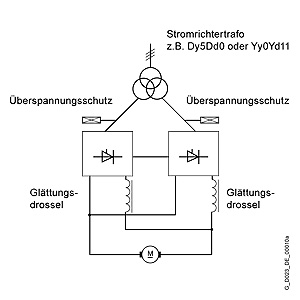SINAMICS DC MASTER 12-пульсный режимПри 12-пульсном режиме два преобразователя SINAMICS DC MASTER питаются напряжениями, сдвинутыми на 30 градусов. Эта конфигурация сокращает гармоники. Каждый преобразователь берет на себя половину общего тока. Один SINAMICS DC MASTER работает в режиме регулирования скорости, второй – в режиме регулирования тока. Ввод задания по току от первого SINAMICS DC MASTER ко второму производится по связи peer-to-peer. При 12-пульсном режиме требуются сглаживающие дроссели в цепи постоянного тока. Расчет сглаживающих дросселей