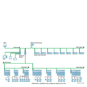 Пример топологии машины производящей подгузники Топология машины производящей подгузникиОптимизированные концепции автоматизации и приводов позволяет создавать гибкие машины. Выбрав систему управления движением SIMOTION, привода SINAMICS S120 и высоко динамичные сервопривода серии 1FK7 вы сможете строить очень гибкие производственные машины. Используя PROFINET вы получаете высоко эффективный обмен данными между системой управления, приводами и вышестоящей производственной системой (MES) |