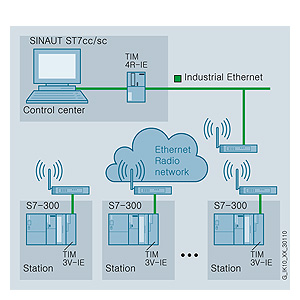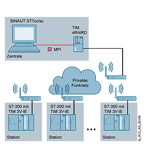 Для работы в радио сети используются радио передатчики, соответствующие требованиям данной страны (радио передатчики не входят в комплект поставки изделий SINAUT). В станции управления (ST7cc или ST7sc) используется модуль TIM 4 (например, TIM 4V), подключаемый к компьютеру через MPI. Если в радио сети используются процедуры обмена данными с разделением по времени, то модуль TIM 4 станции управления должен быть укомплектован приемником сигналов точного времени DCF77. Например, для этой цели может использоваться модуль TIM 4VD.