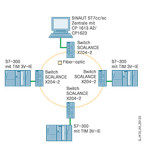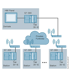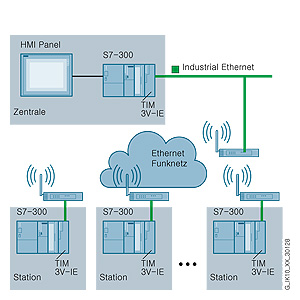 В этом случае функции станции управления выполняет контроллер S7-300 с модулем TIM 3V-IE. Если в радио сети используются процедуры обмена данными с разделением по времени, то модуль TIM 3V-IE необходимо заменить на модуль TIM 4 с приемником DCF77. Например, на модуль TIM 4VD.