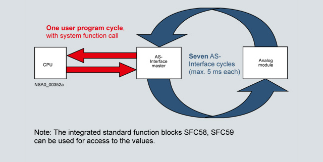 Для обмена данными между ведущим устройством AS-Interface и аналоговым модулем профиля 7.1/7.2 требуется 7 полных циклов шины AS-Interface. Подобный обмен данными возможен только с ведущими устрой-ствами AS-Interface спецификации V2.1. В случае опроса модуля ввода аналоговых сигналов результат аналого-цифрового преобразования накапливается в ведущем устройстве. Формирование окончательного значения измеренной аналоговой величины выполняет ведущее устройство AS-Interface. Программа пользователя получает результат аналого-цифрового преобразования в виде готовой величины после формирования очередного запроса к ведущему устройству AS-Interface. Передача этого значения выполняется очень быстро. Обслуживание аналоговых выходов производится в обратном порядке. Требуемое значение аналоговой величины загружается из контроллера в ведущее устройство AS-Interface после чего передается в аналоговый модуль за 7 циклов шины AS-Interface.
