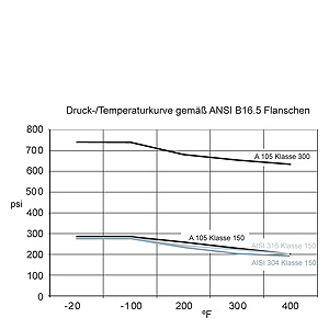 Pressure-temperature curve to EN (DIN) flanges, material A 105 carbon steelPressure-temperature curve to EN (DIN) flanges AISI 304Pressure-temperature curve to EN (DIN) flanges AISI 316Pressure-temperature curve to ANSI B16.5 flangesNote: The pressure-temperature curves only assist in the selection of a system. No responsibility is taken for the correctness of the information. For exact data please refer to the PED requirements. |
