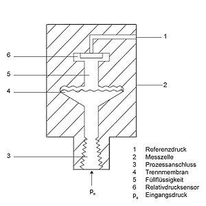Measuring cell for gauge pressure Measuring cell for gauge pressure, function diagram The input pressure (pe) is transferred to the gauge pressure sensor (6) via the seal diaphragm (4) and the filling liquid (5), displacing its measuring diaphragm. The displacement changes the resistance value of the four piezo resistors in the measuring diaphragm in a bridge circuit. The change in the resistance causes a bridge output voltage proportional to the input pressure. Transmitters with spans ≤ 63 bar (≤ 926.1 psi) measure the input pressure compared to atmospheric, those with spans ≥ 160 bar (≥ 2352 psi) compared to a vacuum. Measuring cell for absolute pressure Measuring cell for absolute pressure, function diagram The input pressure (pe) is transferred to the absolute pressure sensor (5) via the seal diaphragm (3) and the filling liquid (4), displacing its measuring diaphragm. The displacement changes the resistance value of the four piezo resistors in the measuring diaphragm in a bridge circuit. The change in the resistance causes a bridge output voltage proportional to the input pressure. Measuring cell for gauge pressure, flush-mounted diaphragm Measuring cell for gauge pressure, flush-mounted diaphragm, function diagram The input pressure (pe) is transferred to the gauge pressure sensor (6) via the seal diaphragm (4) and the filling liquid (5), displacing its measuring diaphragm. The displacement changes the resistance value of the four piezo resistors in the measuring diaphragm in a bridge circuit. The change in the resistance causes a bridge output voltage proportional to the input pressure. Transmitters with spans ≤ 63 bar (≤ 926.1 psi) measure the input pressure compared to atmospheric, those with spans ≥ 160 bar (≥ 2352 psi) compared to a vacuum. Measuring cell for absolute pressure, flush-mounted diaphragm Measuring cell for absolute pressure, flush-mounted diaphragm, function diagram The input pressure (pe) is transferred to the absolute pressure sensor (5) via the seal diaphragm (3) and the filling liquid (4), displacing its measuring diaphragm. The displacement changes the resistance value of the four piezo resistors in the measuring diaphragm in a bridge circuit. The change in the resistance causes a bridge output voltage proportional to the input pressure. Parameterization of SITRANS P300Depending on the version, there are a range of options for parameterizing the pressure transmitter and for setting or scanning the parameters. Parameterization using the input buttons (local operation) With the input buttons you can easily set the most important parameters without any additional equipment. Parameterization using HART communication Parameterization using HART communication is performed with a HART communicator or a PC. Communication between a HART communicator and a pressure transmitter When parameterizing with the HART communicator, the connection is made directly to the 2-wire cable. HART communication between a PC communicator and a pressure transmitter When parameterizing with a PC, the connection is made through a HART modem. The signals needed for communication in conformity with the HART 5.x or 6.x protocols are superimposed on the output current using the Frequency Shift Keying (FSK) method. Adjustable parameters on SITRANS P300 with HART communication
