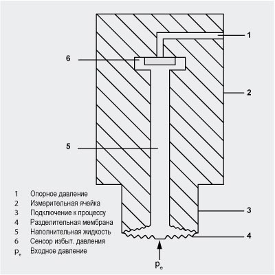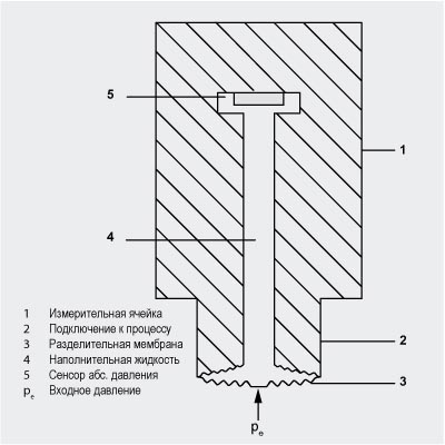 Operation of electronics with HART communicationFunction diagram of electronics The input pressure is converted into an electrical signal by the sensor (1). This signal is amplified by the measuring amplifier (2) and digitalized in an analog-to-digital converter (3). The digital signal is analyzed in a microcontroller (4) and corrected according to linearity and thermal characteristics. In a digital-to-analog converter (5) it is then converted into the output current of 4 to 20 mA. A diode circuit provides reverse polarity protection. You can make an uninterrupted current measurement with a low-ohm ammeter at the connection (10). The data specific to the measuring cell, the electronic data and parameter settings are stored in two non-volatile memories (6). The first memory is linked to the measuring cell, the second to the electronics. The buttons (8) can be used to call up individual functions, so-called modes. If you have a device with a digital display (9), you can use this to track mode settings and other messages. The basic mode settings can be changed with a computer via the HART modem (7). Operation of electronics with PROFIBUS PA communicationFunction diagram of electronics The input pressure is converted into an electrical signal by the sensor (1). This signal is amplified by the measuring amplifier (2) and digitalized in an analog-to-digital converter (3). The digital signal is analyzed in a microcontroller (4) and corrected according to linearity and thermal characteristics. It is then made available at the PROFIBUS PA over an electrically isolated PROFIBUS PA interface (7). The data specific to the measuring cell, the electronic data and parameter settings are stored in two non-volatile memories (6). The first memory is linked to the measuring cell, the second to the electronics. The buttons (8) can be used to call up individual functions, so-called modes. If you have a device with a digital display (9), you can use this to track mode settings and other messages. The basic mode settings can be changed with a computer over the bus master (12). Operation of electronics with FOUNDATION fieldbus communicationFunction diagram of electronics The bridge output voltage created by the sensor (1, Figure "Function diagram of electronics") is amplified by the measuring amplifier (2) and digitized in the analog-to-digital converter (3). The digital information is evaluated in the microcontroller, its linearity and temperature response corrected, and provided on the FOUNDATION fieldbus through an electrically isolated FOUNDATION fieldbus interface (7). The data specific to the measuring cell, the electronics data, and the parameter data are stored in the two non-volatile memories (6). The one memory is coupled to the measuring cell, the other to the electronics. As the result of this modular design, the electronics and the measuring cell can be replaced separately from each other. Using the three input buttons (8) you can parameterize the pressure transmitter directly at the measuring point. The input buttons can also be used to control the view of the results, the error messages and the operating modes on the digital display (9). The results with status values and diagnostic values are transferred by cyclic data transmission on the FOUNDATION fieldbus. Parameterization data and error messages are transferred by acyclic data transmission. Special software such as National Instruments Configurator is required for this. Mode of operation of the measuring cellsThe process connections available include the following: