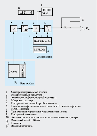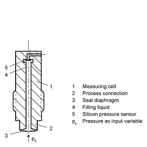 Operation of electronics with HART communicationFunction diagram of electronics The bridge output voltage created by the sensor (1, Figure "Function diagram of electronics") is amplified by the measuring amplifier (2) and digitized in the analog-to-digital converter (3). The digital information is evaluated in a microcontroller, its linearity and temperature response corrected, and converted in a digital-to-analog converter (5) into an output current of 4 to 20 mA. The diode circuit (10) protects against incorrect polarity. The data specific to the measuring cell, the electronics data, and the parameter data are stored in the two non-volatile memories (6). The one memory is coupled to the measuring cell, the other to the electronics. As the result of this modular design, the electronics and the measuring cell can be replaced separately from each other. Using the 3 input keys (8) you can parameterize the pressure transmitter directly at the measuring point. The input keys can also be used to control the view of the results, the error messages and the operating modes on the digital display (9). The HART modem (7) permits parameterization using a protocol according to the HART specification. The pressure transmitters with spans ≤ 63 bar g measure the input pressure compared to atmosphere, the transmitters with spans ≥ 160 bar g measure compared to vacuum. Operation of electronics with PROFIBUS PA communicationFunction diagram of electronics The bridge output voltage created by the sensor (1, Figure "Function diagram of electronics") is amplified by the measuring amplifier (2) and digitized in the analog-to-digital converter (3). The digital information is evaluated in the microcontroller, its linearity and temperature response corrected, and provided on the PROFIBUS PA through an electrically isolated PA interface (7). The data specific to the measuring cell, the electronics data, and the parameter data are stored in the two non-volatile memories (6). The first memory is linked with the measuring cell, the second with the electronics. This modular design means that the electronics and the measuring cell can be replaced separately from one another. Using the three input keys (8) you can parameterize the pressure transmitter directly at the measuring point. The input keys can also be used to control the view of the results, the error messages and the operating modes on the digital display (9). The results with status values and diagnostic values are transferred by cyclic data transmission on the PROFIBUS PA. Parameterization data and error messages are transferred by acyclic data transmission. Special software such as SIMATIC PDM is required for this. Operation of electronics with FOUNDATION fieldbus communicationFunction diagram of electronics The bridge output voltage created by the sensor (1, Figure "Function diagram of electronics") is amplified by the measuring amplifier (2) and digitized in the analog-to-digital converter (3). The digital information is evaluated in the microcontroller, its linearity and temperature response corrected, and provided on the FOUNDATION fieldbus through an electrically isolated FOUNDATION fieldbus interface (7). The data specific to the measuring cell, the electronics data, and the parameter data are stored in the two non-volatile memories (6). The one memory is coupled to the measuring cell, the other to the electronics. As the result of this modular design, the electronics and the measuring cell can be replaced separately from each other. Using the three input keys (8) you can parameterize the pressure transmitter directly at the measuring point. The input keys can also be used to control the view of the results, the error messages and the operating modes on the digital display (9). The results with status values and diagnostic values are transferred by cyclic data transmission on the FOUNDATION fieldbus. Parameterization data and error messages are transferred by acyclic data transmission. Special software such as National Instruments Configurator is required for this. Mode of operation of the measuring cellMeasuring cell for gage pressure with flush-mounted diaphragm Measuring cell for gage pressure, with flush-mounted diaphragm for paper industry, function diagram The pressure pe is applied through the process connection (2, Figure "Measuring cell for gage pressure, with flush-mounted diaphragm for paper industry, function diagram") to the measuring cell (1). This pressure is subsequently transmitted further through the seal diaphragm (3) and the filling liquid (4) to the silicon pressure sensor (5) whose measuring diaphragm is then flexed. This changes the resistance of the four piezo-resistors fitted in the diaphragm in a bridge circuit. This change in resistance results in a bridge output voltage proportional to the absolute pressure. ParameterizationDepending on the version, there are a range of options for parameterizing the pressure transmitter and for setting or scanning the parameters. Parameterization using the input keys (local operation) With the input keys you can easily set the most important parameters without any additional equipment. Parameterization using HART communication Parameterization using HART communication is performed with a HART communicator or a PC. Communication between a HART communicator and a pressure transmitter When parameterizing with the HART communicator, the connection is made directly to the 2-wire cable. HART communication between a PC communicator and a pressure transmitter When parameterizing with a PC, the connection is made through a HART modem. The signals needed for communication in conformity with the HART 5.x or 6.x protocols are superimposed on the output current using the Frequency Shift Keying (FSK) method. Adjustable parameter DS III HART and P300 HART