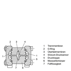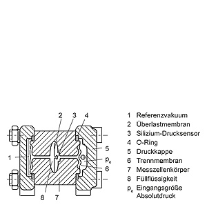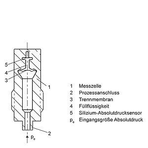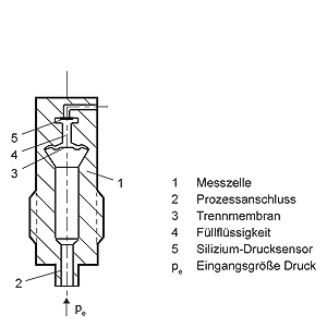 Mode of operation of the DS III HART electronicsFunction diagram of the electronics The bridge output voltage created by the sensor (1, Figure "Function diagram of the electronics“) is amplified by the instrument amplifier (2) and digitized in the analog-to-digital converter (3). The digital information is evaluated in a microcontroller, its linearity and temperature response corrected, and converted in a digital-to-analog converter (5) into an output current of 4 to 20 mA. The diode circuit (10) protects against incorrect polarity. The data specific to the measuring cell, the electronics data, and the parameter data are stored in the two non-volatile memories (6). The one memory is coupled to the measuring cell, the other to the electronics. As the result of this modular design, the electronics and the measuring cell can be replaced separately from each other. Using the 3 input keys (8) you can parameterize the pressure transmitter directly at the point of measurement. The input keys can also be used to control the view of the results, the error messages and the operating modes on the digital display (9). The HART modem (7) permits parameterization using a protocol according to the HART specification. The pressure transmitters with spans ≤ 63 bar measure the input pressure compared to atmosphere, transmitters with spans ≥ 160 bar compared to vacuum. Mode of operation of the DS III PA electronicsFunction diagram of the electronics The bridge output voltage created by the sensor (1, Figure "Function diagram of the electronics“) is amplified by the instrument amplifier (2) and digitized in the analog-to-digital converter (3). The digital information is evaluated in the microcontroller, its linearity and temperature response corrected, and provided on the PROFIBUS PA through an electrically isolated PA interface (7). The data specific to the measuring cell, the electronics data, and the parameter data are stored in the two non-volatile memories (6). The first memory is linked with the measuring cell, the second with the electronics. This modular design means that the electronics and the measuring cell can be replaced separately from one another. Using the three input keys (8) you can parameterize the pressure transmitter directly at the point of measurement. The input keys can also be used to control the view of the results, the error messages and the operating modes on the digital display (9). The results with status values and diagnostic values are transferred by cyclic data transmission on the PROFIBUS PA. Parameterization data and error messages are transferred by acyclic data transmission. Special software such as SIMATIC PDM is required for this. Mode of operation of the DS III FF electronicsFunction diagram of the electronics The bridge output voltage created by the sensor (1, Figure "Function diagram of the electronics“) is amplified by the instrument amplifier (2) and digitized in the analog-to-digital converter (3). The digital information is evaluated in the microcontroller, its linearity and temperature response corrected, and provided on the Foundation Fieldbus through an electrically isolated Foundation Fieldbus Interface (7). The data specific to the measuring cell, the electronics data, and the parameter data are stored in the two non-volatile memories (6). The one memory is coupled to the measuring cell, the other to the electronics. As the result of this modular design, the electronics and the measuring cell can be replaced separately from each other. Using the three input keys (8) you can parameterize the pressure transmitter directly at the point of measurement. The input keys can also be used to control the view of the results, the error messages and the operating modes on the digital display (9). The results with status values and diagnostic values are transferred by cyclic data transmission on the Foundation Fieldbus. Parameterization data and error messages are transferred by acyclic data transmission. Special software such as National Instruments Configurator is required for this. Mode of operation of the measuring cellsMeasuring cell for gage pressure Measuring cell for gage pressure, function diagram The pressure pe is applied through the process connection (2, Figure "Measuring cell for gage pressure, function diagram) to the measuring cell (1). This pressure is subsequently transmitted further through the seal diaphragm (3) and the filling liquid (4) to the silicon pressure sensor (5) whose measuring diaphragm is then flexed. This changes the resistance of the four piezo-resistors fitted in the diaphragm in a bridge circuit. This change in resistance results in a bridge output voltage proportional to the input pressure. Measuring cell for gage pressure, with front-flush diaphragm for paper industry Measuring cell for gage pressure, with front-flush diaphragm for paper industry, function diagram The pressure pe is applied through the process connection (2, Figure "Measuring cell for gage pressure, with front-flush diaphragm for paper industry, function diagram") to the measuring cell (1). This pressure is subsequently transmitted further through the seal diaphragm (3) and the filling liquid (4) to the silicon pressure sensor (5) whose measuring diaphragm is then flexed. This changes the resistance of the four piezo-resistors fitted in the diaphragm in a bridge circuit. This change in resistance results in a bridge output voltage proportional to the input pressure. Measuring cell for absolute pressure from gage pressure series Measuring cell for absolute pressure from the pressure series, function diagram The absolute pressure pe is transmitted through the seal diaphragm (3, Figure "Measuring cell for absolute pressure from gage pressure series, function diagram“) and the filling liquid (4) to the silicon absolute pressure sensor (5) whose measuring diaphragm is then flexed. This changes the resistance of the four piezo-resistors fitted in the diaphrag