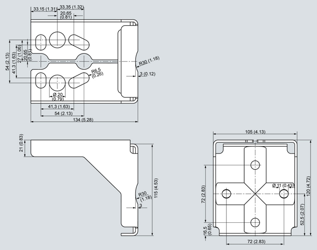 Mounting bracket for SITRANS P pressure transmitter, P500 series, measurements in mm Mounting bracket material: Sheet-steel Mat. No. 1.0330, chrome-plated, or stainless steel Mat. No. 1.4301 (304) |