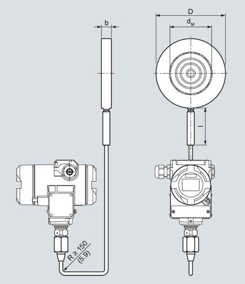 d: Inside diameter of gasket according to EN 1092-1 / ASME B16.5 dM: Effective diaphragm diameter Diaphragm seals of sandwich design (without flange) with flexible capillary for connection to SITRANS P pressure transmitters for absolute pressure or differential pressure and flow, dimensions in mm (inch) |