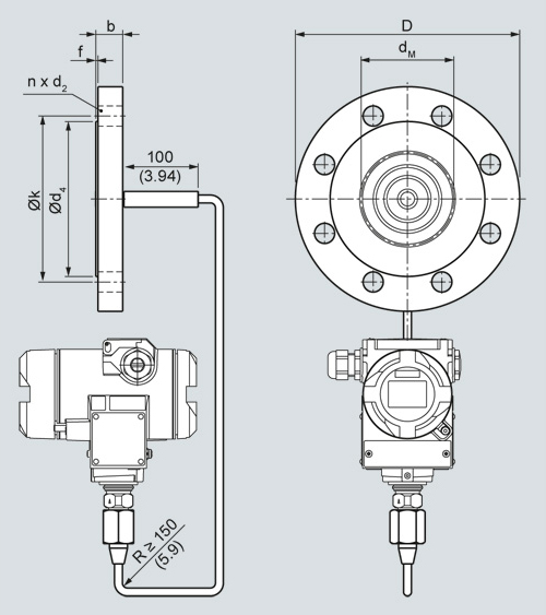 Diaphragm seals of flange design with flexible capillary for connection to SITRANS P pressure transmitters for pressure, dimensions in mm (inch)