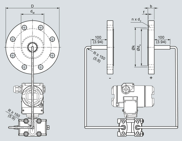 Diaphragm seals of flange design with flexible capillary for connection to SITRANS P pressure transmitters for absolute pressure or for differential pressure and flow, dimensions in mm (inch)