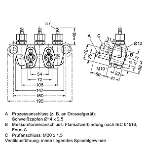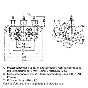 3-way valve manifold DN 8 (7MF9416-1..), with pipe union, dimensions in mm 3-way valve manifold DN 8 (7MF9416-2..), with welding pins, dimensions in mm Mounting plate 7MF9006-6.. (M11, M12) for valve manifold, dimensions in mm |