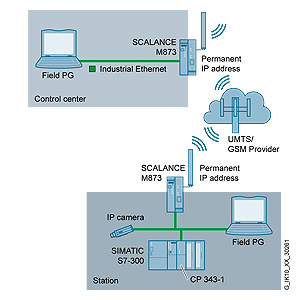 Пример подключения станции S7-300 с модулем TIM 3V-IE и маршрутизатора SCALANCE M873 к центру управления (SINAUT ST7cc или ST7sc) через UMTS и Интернет. За модулем SCALANCE S установлен коммуникационный модуль TIM 4R-IE. Центр управления использует модуль SCALANCE S для SINAUT обмена данными со станциями, подключенными через Интернет, а также со станциями, подключенными к модулю TIM 4R-IE через две другие сети. Маршрутизацию перекрестного трафика между отдельными станциями выполняет модуль TIM 4R-IE.