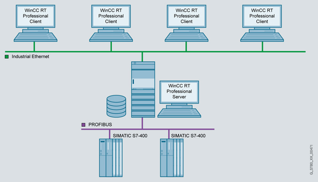 Обмен данными между клиентами и сервером выполняется на основе протокола TCP/IP. Для такого обмена рекомендуется использовать отдельную локальную сеть компьютеров. В небольших проектах с относительно небольшими объемами передаваемых данных допускается использовать сеть Industrial Ethernet как для обмена данными с контроллерами (WinCC/сервер ↔ контроллер), так и для обмена данными между компьютерами (WinCC/клиент ↔ WinCC/сервер).