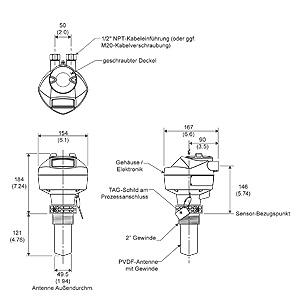 SITRANS LR250 резьбовая PVDF антенна, размеры даны в мм (") |