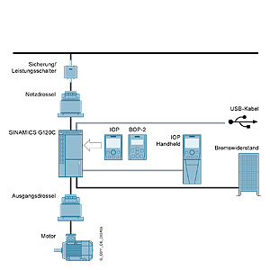 SINAMICS G120C это компактный преобразователь со степенью защиты IP20, объединяющий в одном устройстве такие функциональные блоки, как управляющий модуль (CU) и силовой модуль (PM). Малогабаритная механическая конструкция и высокая удельная мощность позволяют выполнить очень компактный монтаж в распредшкафы станков и в электрошкафы. Компактный преобразователь SINAMICS G120C может быть смонтирован бок-о-бок, без ухудшения характеристик. SINAMICS G120C типоразмер FSB с BOP-2 Интеграция SINAMICS G120C в самые разные приложения возможна по выбору через встроенные цифровые и аналоговые входы или через встроенный интерфейс полевой шины (имеется у вариантов USS/Modbus RTU, PROFIBUS-DP, CANopen). В частности, варианты изделия со встроенным интерфейсом PROFIBUS-DP обеспечивают полную интеграцию в систему TIA от Siemens и использование преимуществ унифицированной линейки продуктов TIA. SINAMICS G120C настроены на заводе для возможности прямого использования без параметрирования в системах полевых шин PROFIBUS-DP и CANopen. Дополнительно SINAMICS G120C стандартно оснащается Safety-функцией STO (Safe Torque Off) для безопасной остановки приводов.Тем самым машиностроители могут исполнять актуальные Директивы по машинному оборудованию просто и с минимальными затратами. SINAMICS G120C может управлять асинхронными двигателями в диапазоне мощностей от 0,37 кВт до 18,5 кВт (0,75 л.с. до 20 л.с.). Надежная и эффективная работа двигателя достигается за счет применения самой современной технологии IGBT в комбинации с модернизированным векторным управлением. Кроме этого, интегрированные в SINAMICS G120C обширные защитные функции предлагают надежную защиту для преобразователя и двигателя. Компоненты со стороны сетиСетевые дроссели Сетевой дроссель используется для сглаживания пиков напряжения (защита преобразователя) и уменьшения провалов коммутации (обратные воздействия на сеть). Рекомендованные активные компоненты со стороны сети Для SINAMICS G120C можно использовать стандартные предохранители. Параметры при этом должны выбираться согласно действующим на месте правилам. В настоящей главе перечислены такие рекомендованные компоненты, как предохранители и силовые выключатели, согласно требованиям IEC и UL. Компоненты промежуточного контураТормозные резисторы Через тормозной резистор отводится избыточная энергия промежуточного контура. Тормозные резисторы предназначены для использования с SINAMICS G120C. Он оборудован встроенным тормозным прерывателем (электронный выключатель). Дополнительные системные компонентыИнтеллектуальная панель оператора IOP Графическая, удобная для пользователя и мощная панель оператора для ввода в эксплуатацию и диагностики, а также для локального управления и наблюдением SINAMICS G120C. Базовая панель оператора BOP-2 2-рядный дисплей для поддержки ввода в эксплуатацию и диагностики привода. Возможно локальное управление приводом. Карты памяти На карты памяти SINAMICS Micro Memory Card (MMC) или SIMATIC Memory Card (SD-Karte) можно сохранить параметрирование пробразователя. При сервисном обслуживании установка, к примеру, после замены преобразователя и передачи данных с карты памяти, снова сразу же готова к работе. Соответствующий держатель карт встроен в преобразователь. Комплект для соединения PC-преобразователь - 2 Для управления и ввода в эксплуатацию преобразователя непосредственно с PC, если на нем установлено соответствующее ПО для ввода в экс