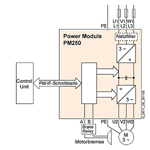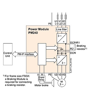 2) В комбинации с силовым модулем PM250 или PM260 осуществляется ведомая сетью рекуперация энергии. Тормозной резистор не может быть подключен и не нужен.