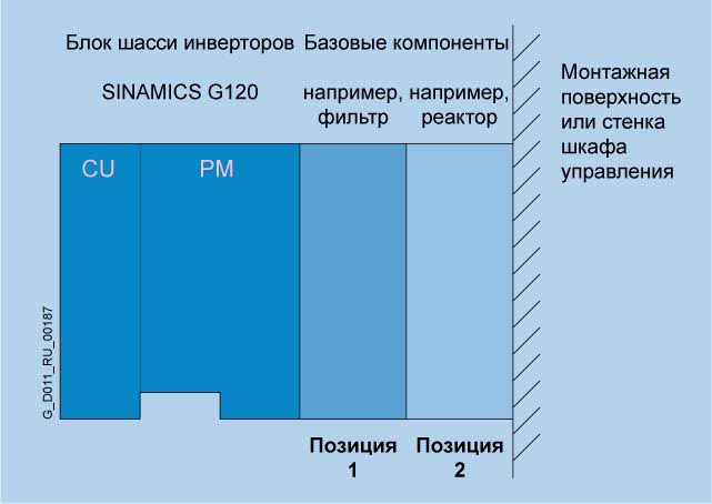 Преобразователь частоты, состоящий из силового модуля (PM) и управляющего модуля (CU) и двух каркасных компонентов на позиции 1 и позиции 2 (вид сбоку)