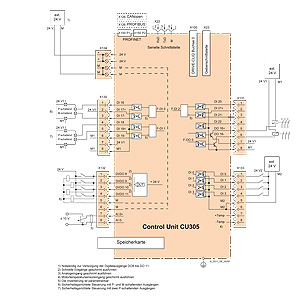 Управляющий модуль CU305 управляет силовым модулем PM340 через PM-IF-интерфейс. Базовая панель оператора BOP20 может быть установлена в управляющий модуль CU305 DP напрямую, к примеру, для диагностики. Для расширенной диагностики и функций ввода в эксплуатацию возможно дополнительное подключение интеллектуальной панели оператора (IOP) к RS232-интерфейсу. Для использования двигателей и без интерфейса DRIVECLiQ, к встроенной розетке DRIVE-CLiQ могут подключаться DRIVE-CLiQ-двигатели или модули датчиков SMC. Состояние CU305 отображается через многоцветные светодиоды. CU305 как опция может работать с картой памяти. Микропрограммное обеспечение и данные проекта находятся на вставляемой снизу карте памяти, поддерживая тем самым замену CU305 без вспомогательных средств. С картой памяти возможен и серийный ввод в эксплуатацию нескольких идентичных приводов. Карта памяти предлагается пустой или с актуальной версией микропрограммного обеспечения привода. Кроме этого, на карту памяти сохраняется Safety-лицензия для расширенных функций Safety. При использовании этих расширенных функций Safety карта памяти с Safety- лицензией должна быть постоянно вставлена. Ввод в эксплуатацию и диагностика CU305, а также подключенных компонентов, выполняются с помощью ПО для ввода в эксплуатацию STARTER.