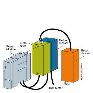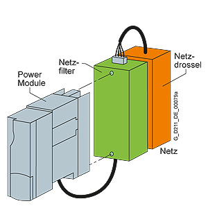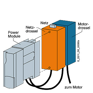 Сетевые дроссели имеют клеммы со стороны сети и кабель с разъемами на стороне силового модуля PM340. У типоразмеров FSA до FSC сетевые клеммы в смонтированном состоянии находятся сверху, у типоразмеров FSD и FSE снизу.