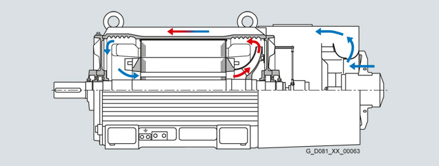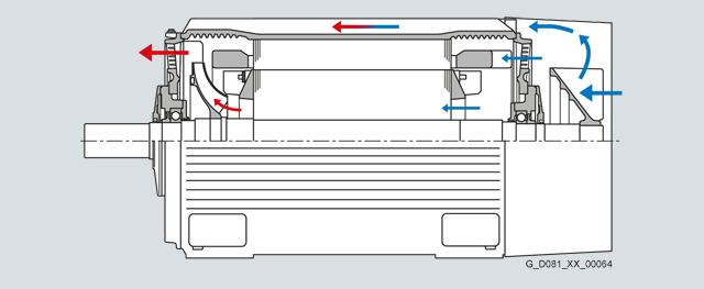 The basic structure of the non-standard motors is shown in the following sectional diagrams. Sectional diagram of 1LA8 Sectional diagram of 1PQ8 Sectional diagram of 1LL8 In conventional fin-cooled motors, the one-sided external ventilation naturally results in an uneven temperature distribution – this is however not the case with SIMOTICS N-compact motors with their additional internal air-flow channels. This cools, in particular, the stator winding heads, the rotor winding and the drive-end bearings. The resulting reduction in thermal loading increases the operating reliability and lengthens the service life. |